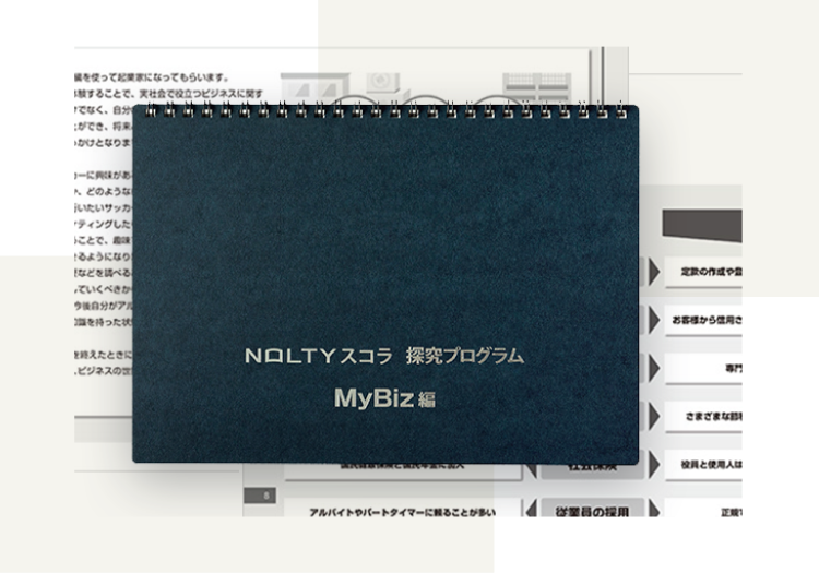 こうして生まれた「NOLTYスコラ 探究プログラム MyBiz編」というワークブックは、 生徒1人1人が自分の興味関心を基に「起業」を疑似体験し、ビジネスを体系立てて学ぶことができます。